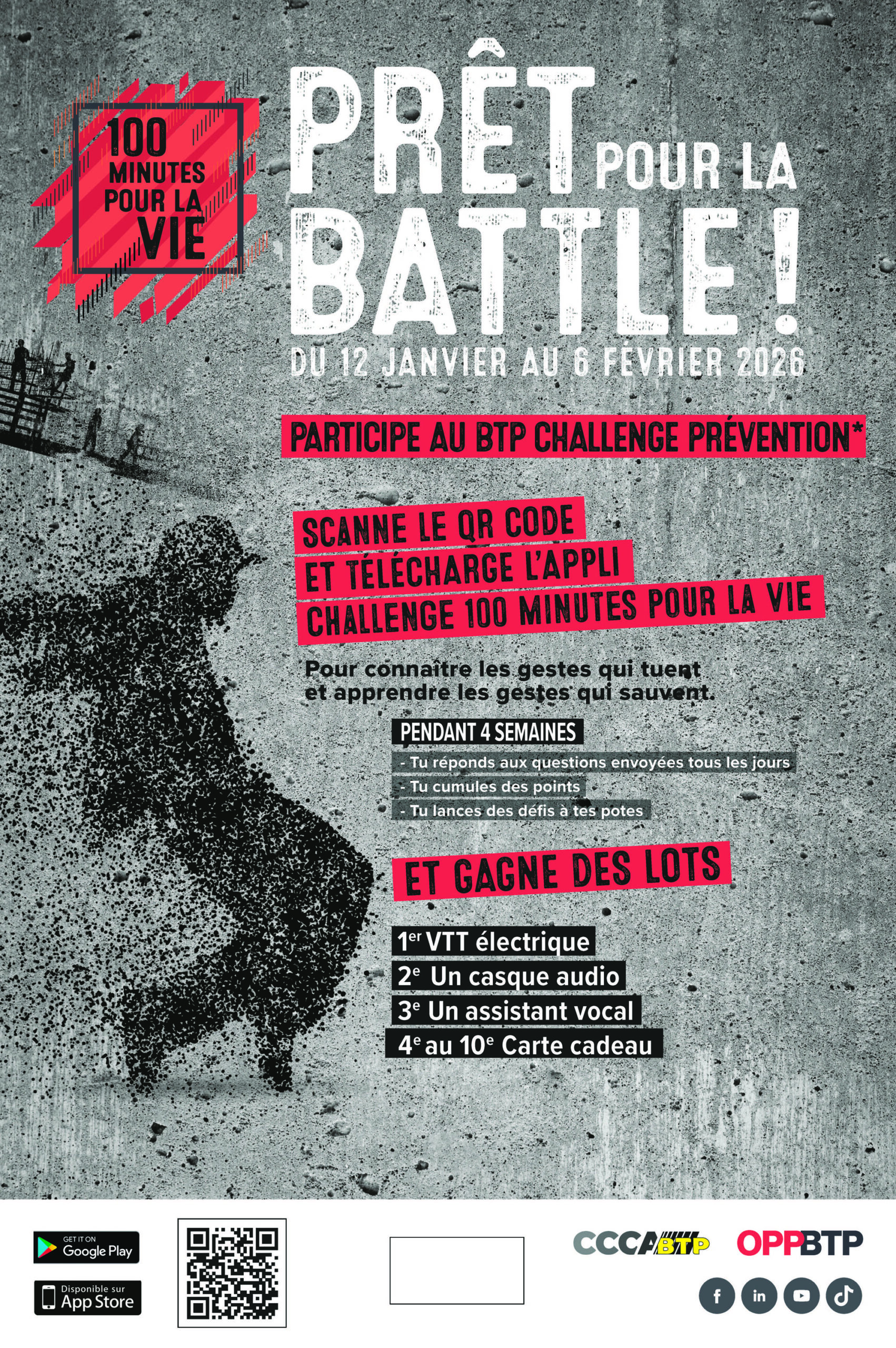Le challenge national « 100 minutes pour la vie », organisé par l’OPPBTP en partenariat avec le CCCA-BTP, se déroule du 12 janvier au 6 février 2026. Destiné aux jeunes en formation dans le BTP, il vise à renforcer la culture de prévention des risques grâce à une application mobile ludique et interactive, dédiée aux thématiques du bâtiment et des travaux publics.